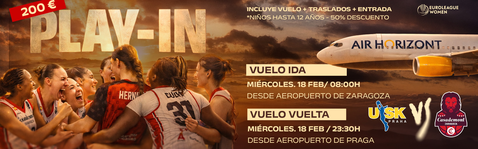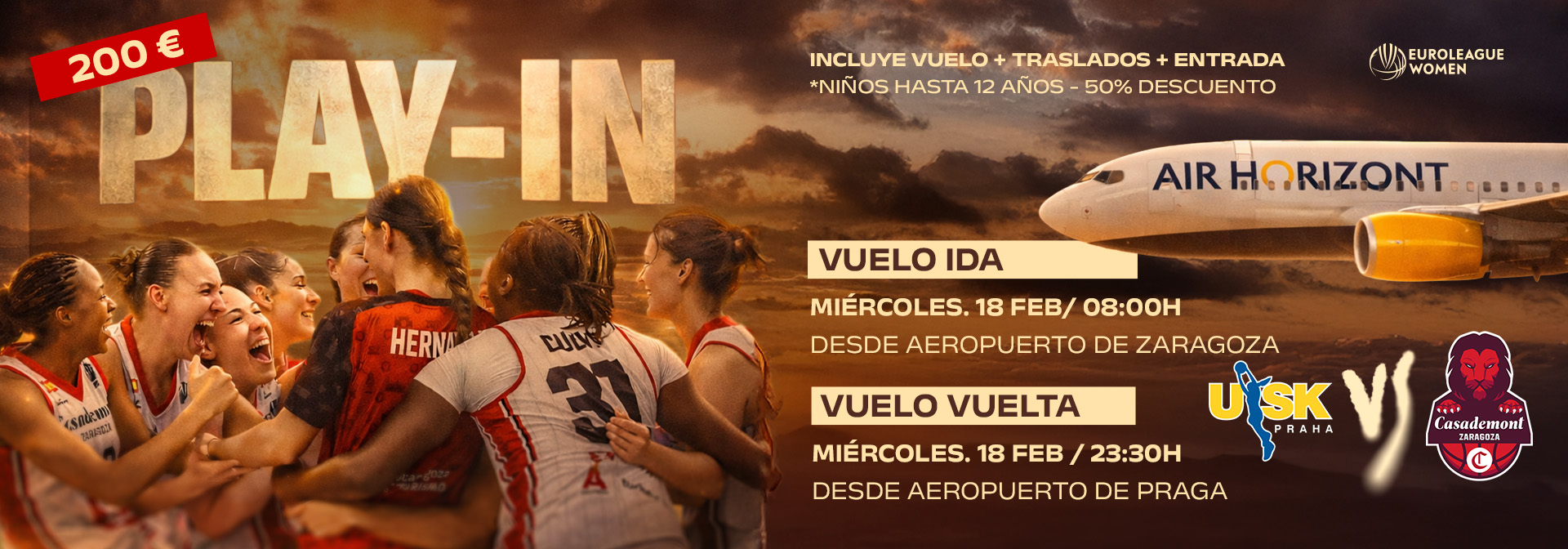 Casademont Zaragoza y Air Horizont lanzan un vuelo chárter para el primer partido. Salida el miércoles 18 de febrero a las 8.00h desde el Aeropuerto de Zaragoza, y regreso el miércoles 18 de febrero a las 23.30h desde el Aeropuerto de Praga. Plazas ya disponibles.