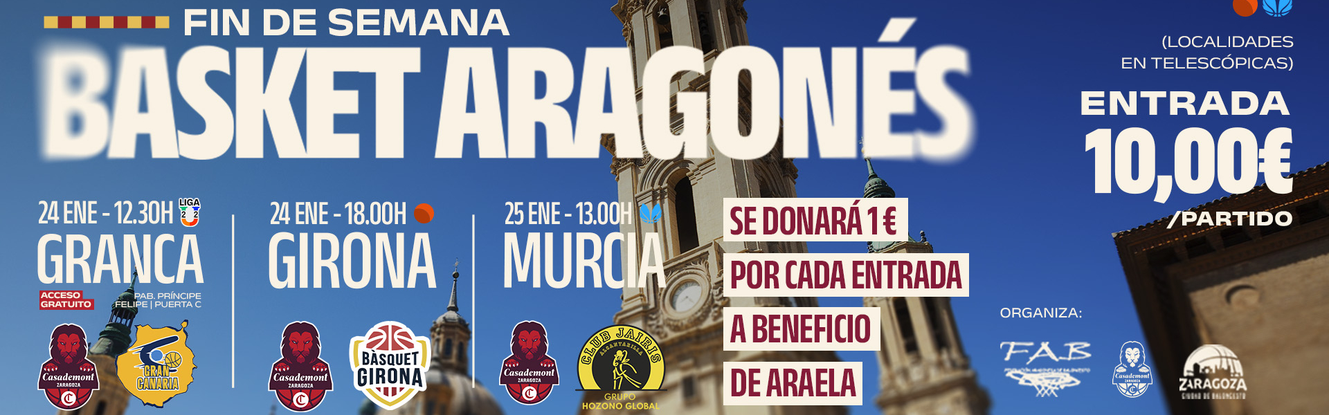 CASADEMONTZARAGOZA.ES Este fin de semana del 24 y 25 de enero se celebra el Fin de Semana del Baloncesto Aragonés en el Príncipe Felipe, coincidiendo con la disputa de los tres partidos de nuestros equipos: frente a Gran Canaria de Liga U el sábado 24 (12.30 horas) con acceso gratuito; frente a Bàsquet Girona de Liga ACB también el sábado 24 (18.00 horas) y ante Hozono Global Jairis de Liga Femenina Endesa el domingo 25 a las 13.00h.